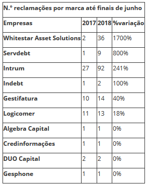 O total das 180 queixas aprovadas e registadas, entre janeiro e junho de 2018, traduz uma subida na ordem dos 210%, face ao período homólogo. No Top 10 das empresas com mais reclamadas estão a ‘Whitestar Asset Solutions’, a ‘Servdebt’ e a ‘Intrum’.
