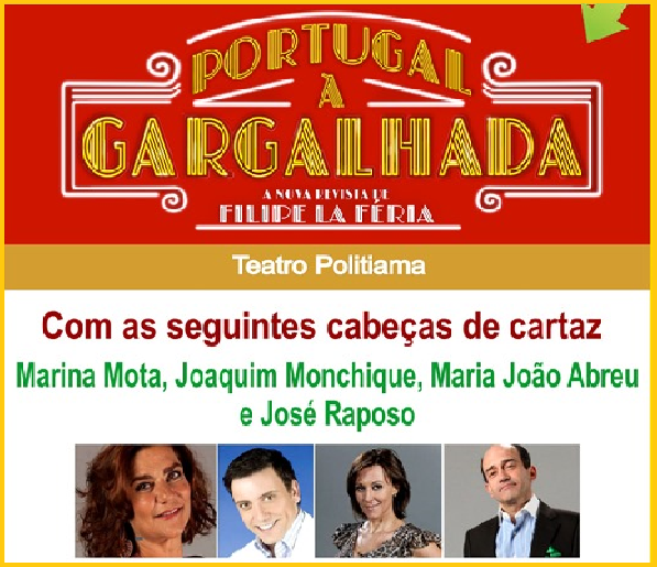 Para este espetáculo Filipe La Féria escolheu quatro grandes comediantes: Marina Mota que é atualmente a maior vedeta da revista à portuguesa e que reaparece, agora ao lado de Joaquim Monchique num regresso ao palco que o revelou como um dos grandes cómicos portugueses. Portugal à Gargalhada marca também o regresso ao Politeama de José Raposo, onde protagonizou A Gaiola das Loucas e Um Violino no Telhado, musical que lhe valeu o Globo de Ouro SIC/Caras de melhor ator; e Maria João Abreu, uma das mais conceituadas atrizes do teatro musical, que com todo o seu talento e beleza a tornaram primeira atriz do teatro de revista. (Compilado da Agenda Cultural de Lisboa)